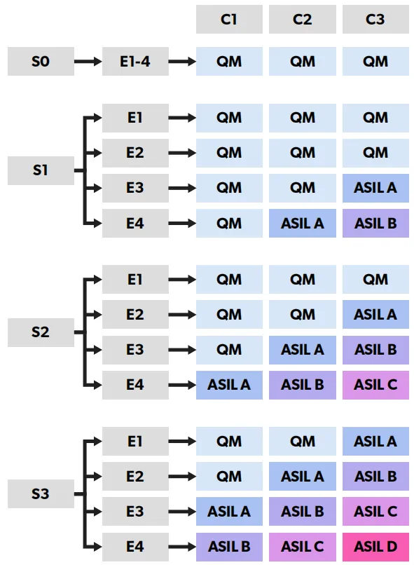 ASIL分為四個等級,從A到D。ASIL A是最低風(fēng)險水平,ASIL D是最高風(fēng)險水平。遵從性要求在從A到D的過程中變得更加嚴(yán)格。QM(質(zhì)量管理)是一個額外的選項,用于沒有安全需求的特定組件。
