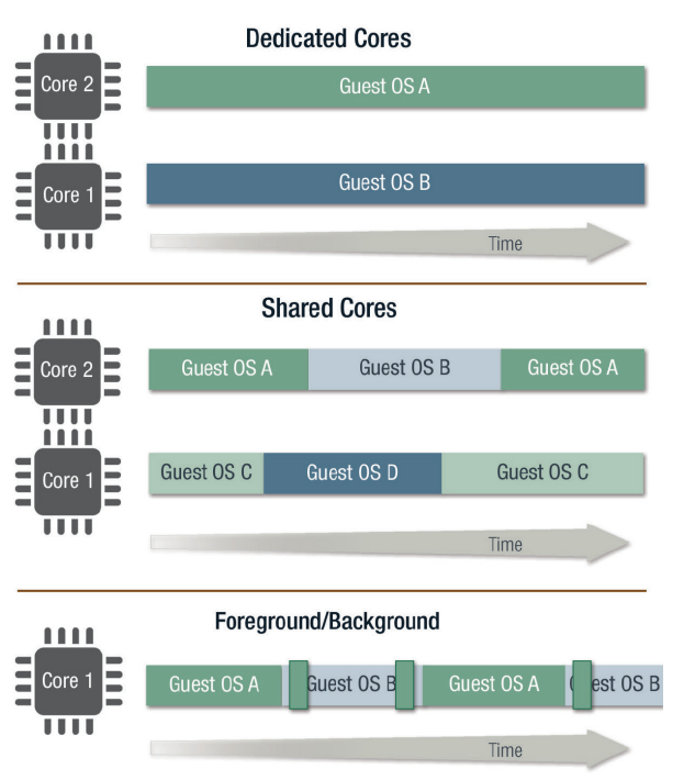 ▲ 共享核心 - 虛擬機可以自由使用任何核心,采用時間片輪轉(zhuǎn)
