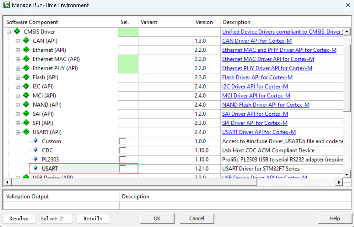 1)、打開工程的"Manage Run-Time Environment"窗口,根據錯誤提示,去掉USART組件,如圖4-1所示: