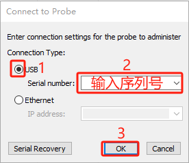 3 在彈出界面選擇中連接方式選擇 USB,并輸入仿真器的序列號(在仿真器下面的標簽上),點擊 OK。