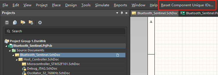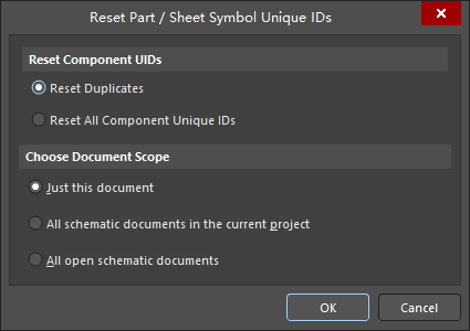 7. 點擊新的菜單Reset Component Unique IDs 選擇復位的器件和文檔范圍,進行Unique ID 的復位。