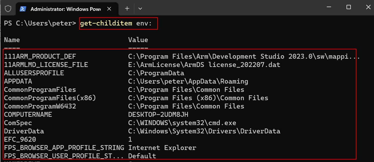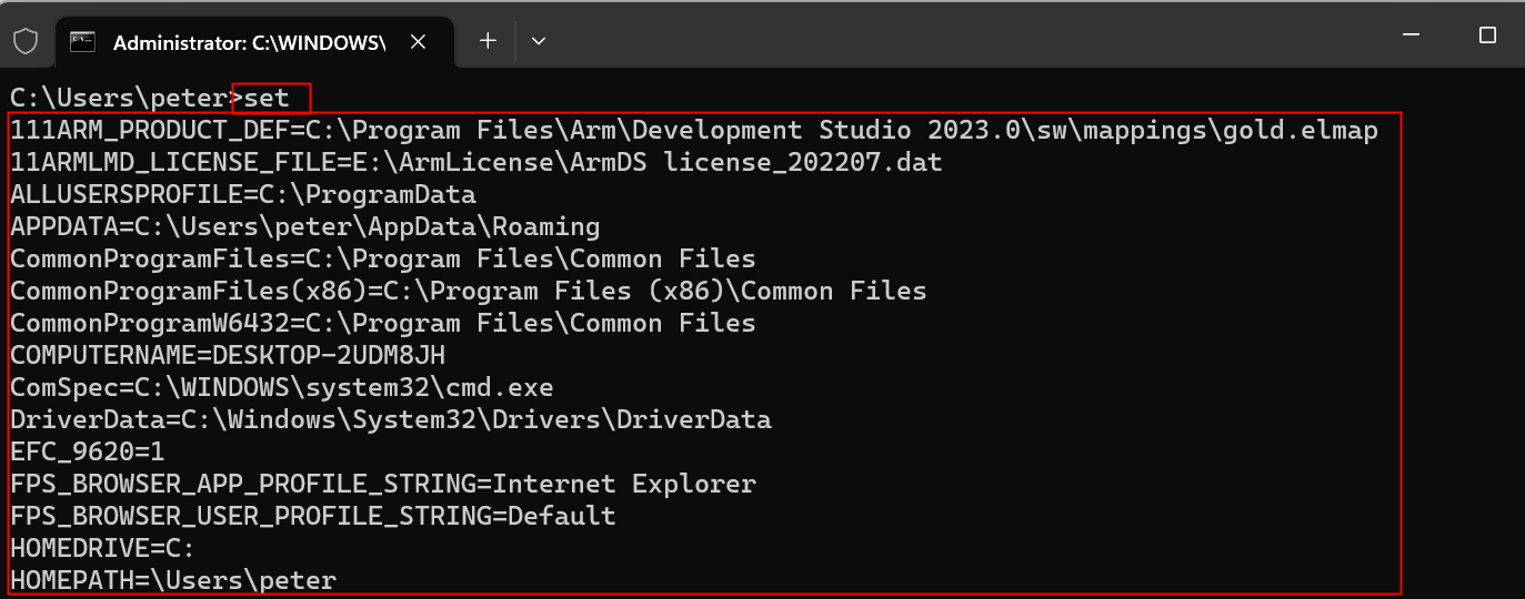 在用Keil MDK、ArmDS及FuSa Compiler的License激活過程中,有時會在命令行下查看相關環境變量的值是否設置正常如何在PowerShell中查看環境變量的值,在Windows11中,命令行有兩種方式,一種是通過“CMD”,另一種是用“PowerShell”方式。在“CMD”方式下,直接輸入“set”就可以看到Windows下的環境變量的值,如圖2-1所示: