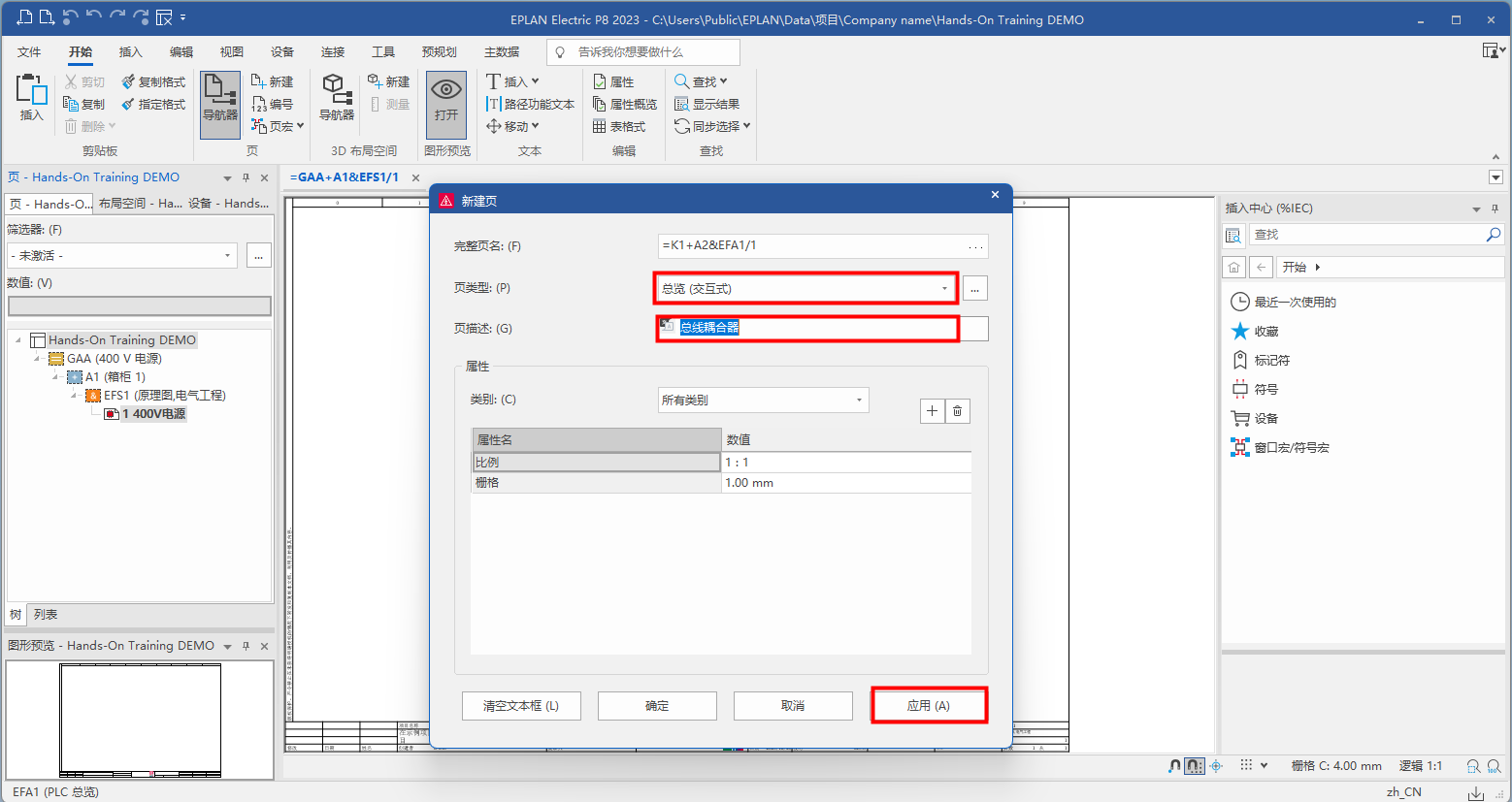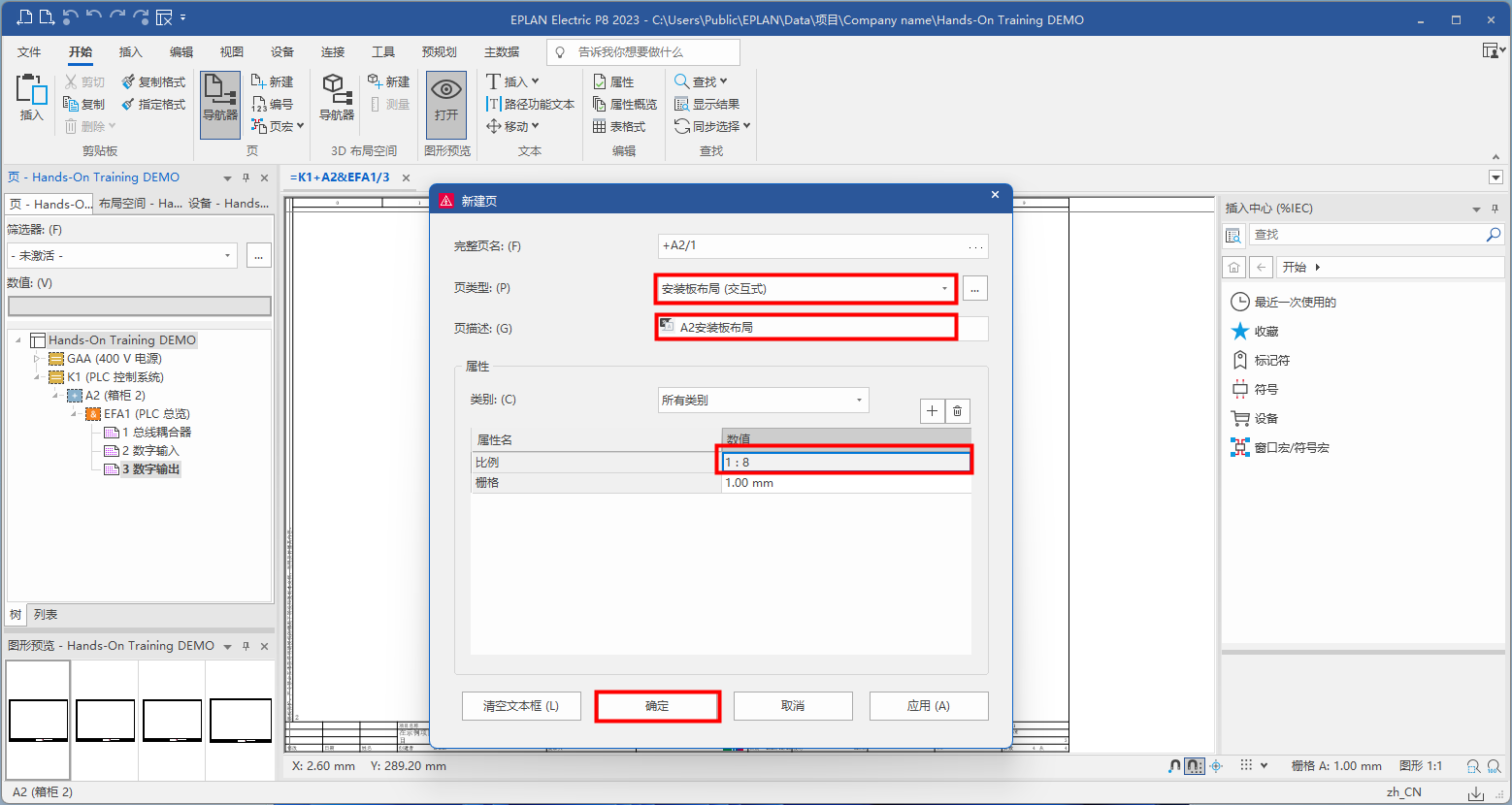 選擇頁類型:安裝板布局;添加頁描述,這里需要修改圖紙比例進行放大,點擊【確定】