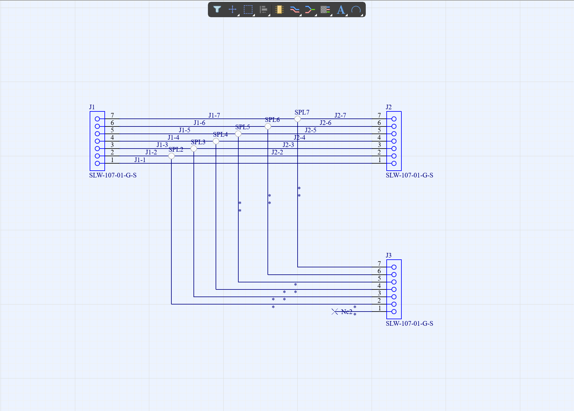 3、將這些管腳連接起來,分別對每個線重新定義他的Designator屬性(這樣可以在后面的Harness Layout中比較明確線束包含哪些段),然后給線上添加連接點,每個連接點也把命名定義清楚,最后在J3中還有未連接的管腳,在上面放置No Connect,如圖4-3。