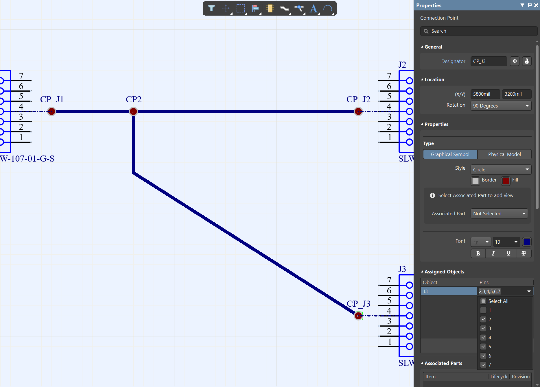 4、雙擊查看線束,連接點的一些屬性,雙擊J3(如圖4-6)設置包含的Pin,由于圖4-3中,該接插件的Pin1沒有連接,JNH官網可以在Pins里面把1的勾選去掉,該點則標識管腳2-7,其他的點也是一樣,如果只勾選單個Pin,則表示單線連接(這會影響到線束標識的信號線),雙擊線束(如圖4-8、圖4-9),可以看到除了J1-1兩邊都有,表示這是同一根線,中間沒有連接點,其他的都是分開成兩段的線合成的線束。其他的在屬性里面修改一些線束和連接點的style。