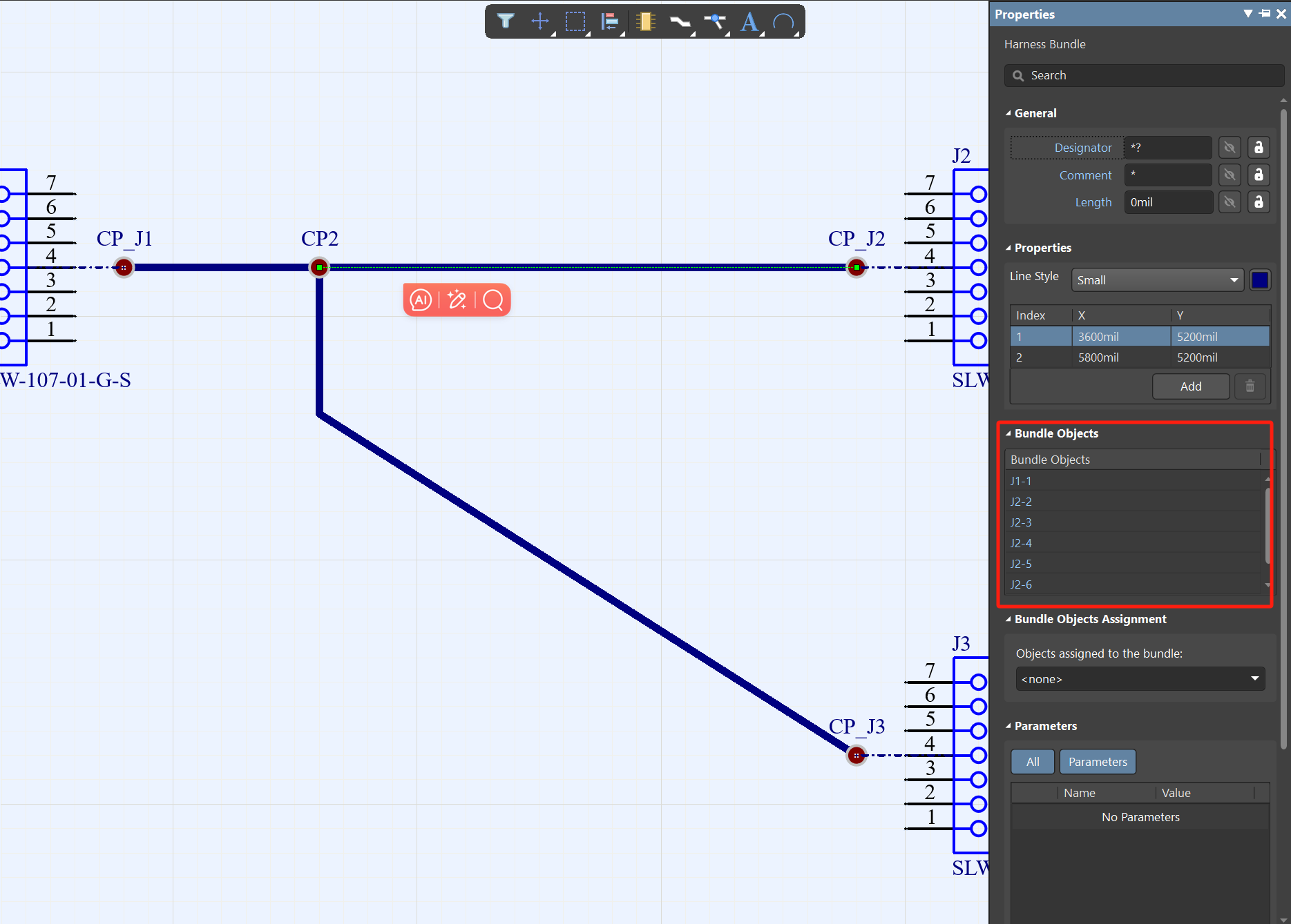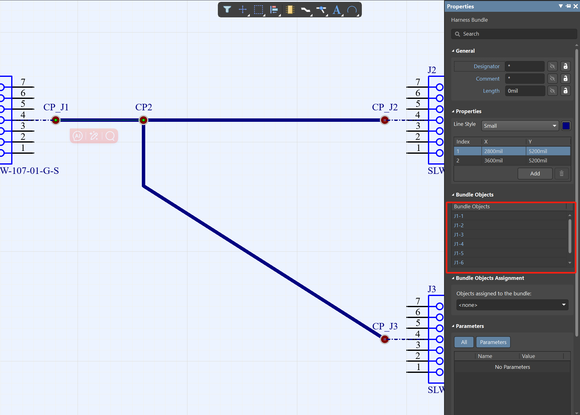 4、設置好了之后再給工程添加Harness Layout文件,然后選擇菜單欄Design-導入接線圖,然后在Place里面放置線束捆綁和連接點,按照連線圖連接好之后,就可以看到比較簡明的線束設計,然后點開對線束每個標識都可以進行更改。