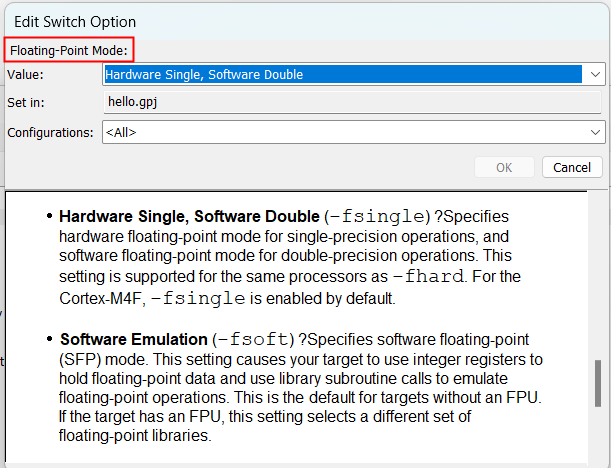 Hardware Single, Software Double (-fsingle) 用于單精度操作的硬件浮點模式,用于雙精度操作的軟件浮點模式。與-hard相同的處理器支持此設置。對于Cortex-M4F,默認開啟-fsingle。