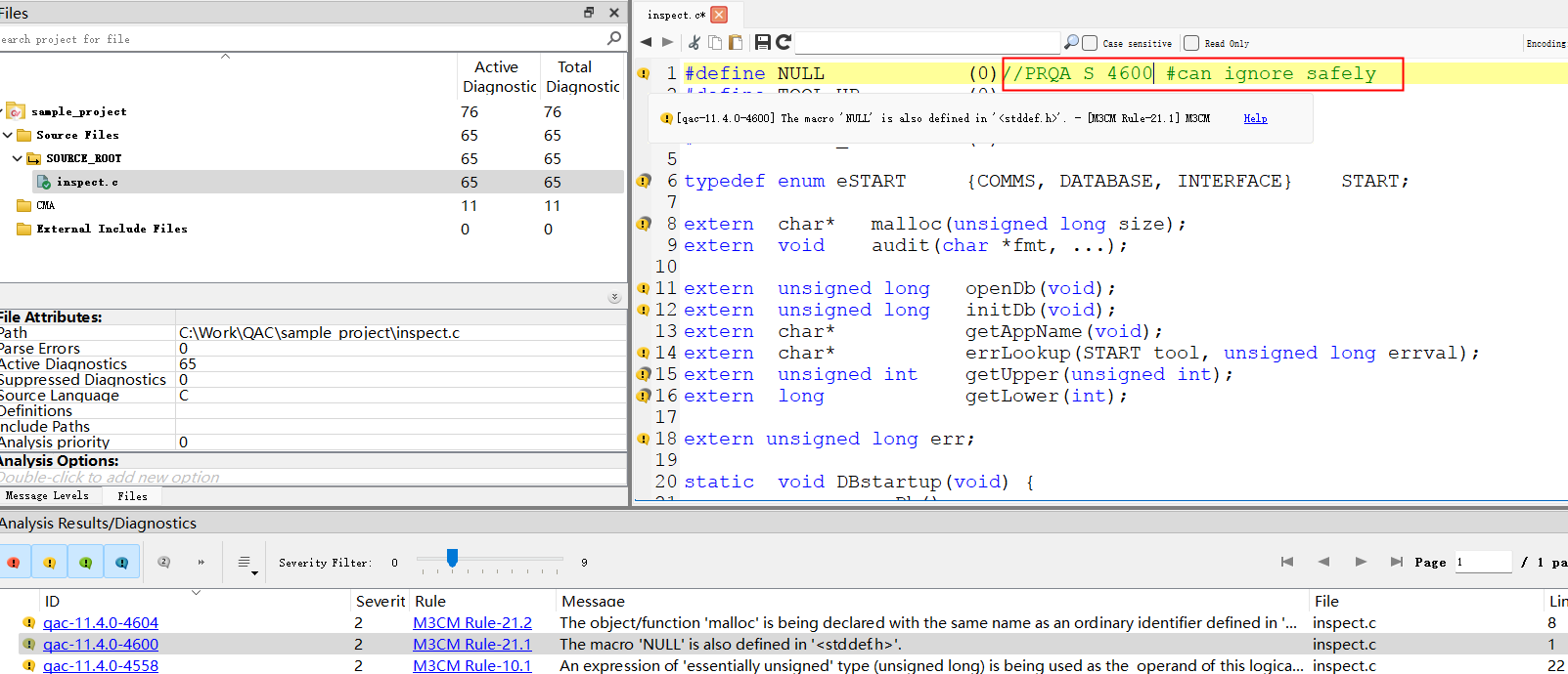 2、在違規(guī)源碼右側(cè)添加注釋“ //PRQA S 4600 #can ignore safely”,保存;