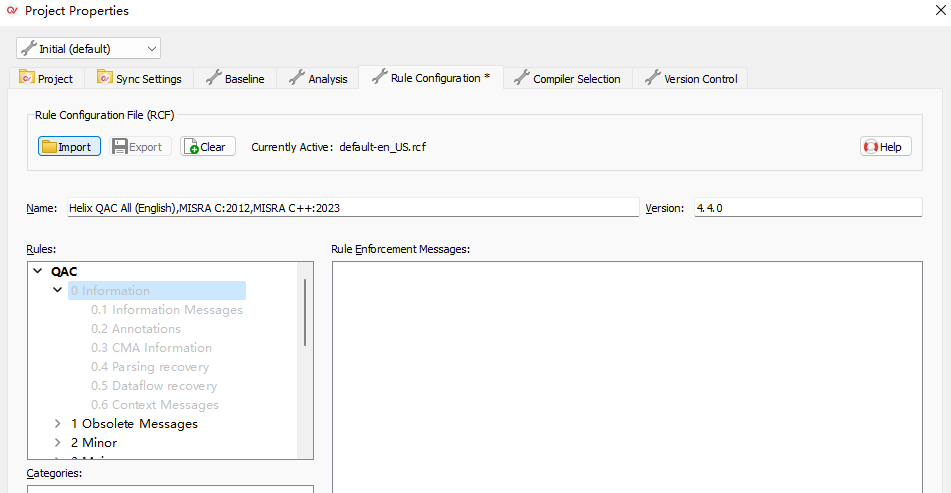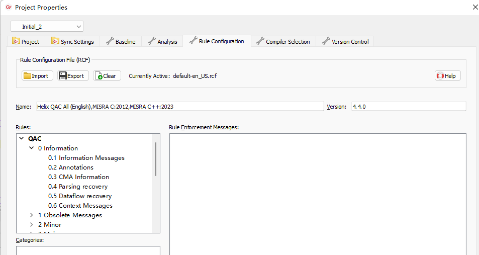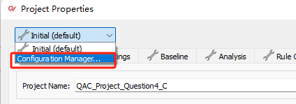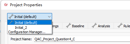 4)、然后,就可以在Project Properties窗口的左上角去切換屬性的配置方案(如圖4-4-1)。兩個配置方案的相關(guān)配置更改不會影響另外一個配置方案。如圖4-4-2中所示,在Initial方案中禁用了QAC規(guī)則的第0等級規(guī)則。而如圖4-4-3中所示,在Initial_2方案中是沒有被禁用的。