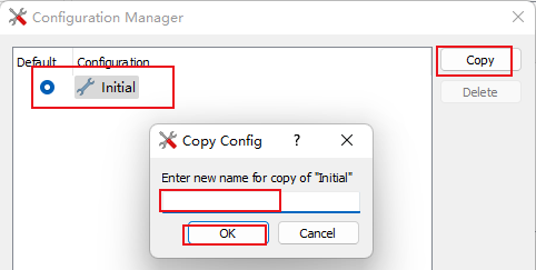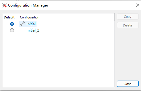 3)、打開Configuration Manager窗口后,可以看到目前只有一個Initial一個工程屬性配置方案。可以通過點擊Initial,然后,點擊Copy。就會出現(xiàn)Copy Config的窗口,在這里輸入新的工程屬性配置方案的名字,例如Initial_2,就會將Initial方案復(fù)制生成Initial_2方案。(如圖4-3-1和圖4-3-2)