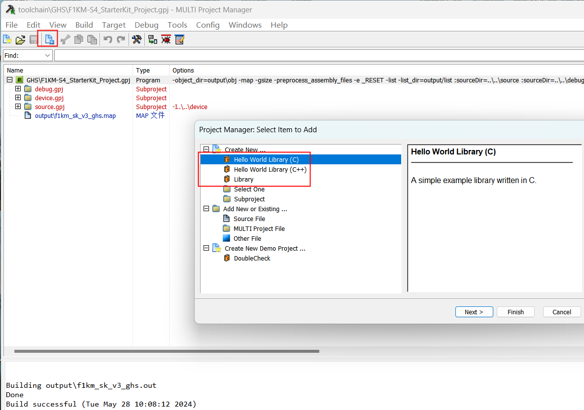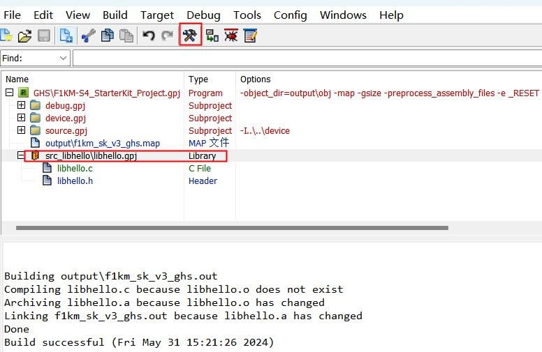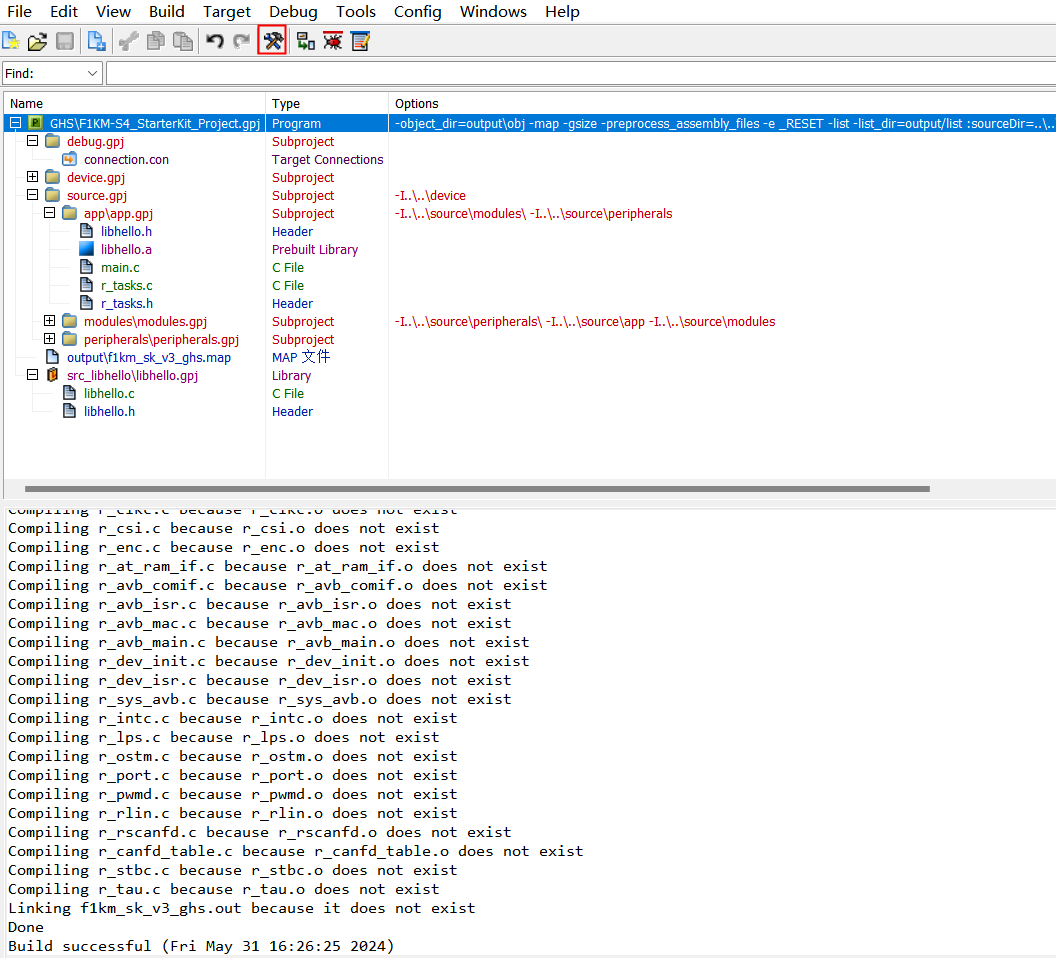 1)、本次采用工程為瑞薩官方例程、Y-ASK-RH850F1KM-S4-V3_sample_V101、打開項目工程,選擇項目編譯成功。點擊如圖添加文件快捷鍵、或者點擊"Edit"再點擊"Add ltem into F1KM-S4 Starterkit Project.gpj...",