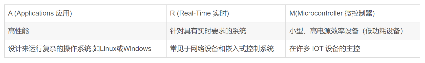 下面表格介紹了 ARM 的 A 、R和 M 三個架構的特點: