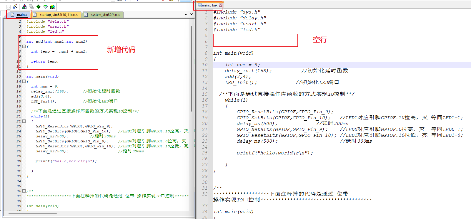 2)、例如,在main文件中添加一個add函數后保存。備份文件就會自動備份沒有add函數之前的源文件(如圖4-3)。