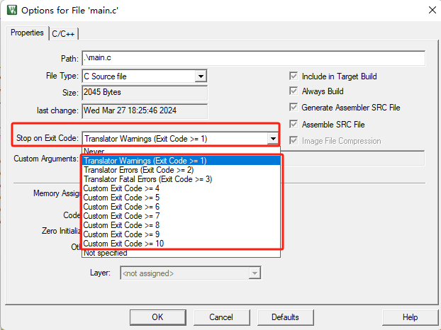 3)、在MDK中可以通過在對于單文件的配置中去設置退出條件。在Option窗口中,在Properties中的Stop on Exit Code中就可以設置退出代碼(如圖4-3)。
