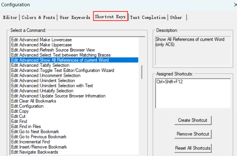 記錄Keil系列產(chǎn)品IDE內(nèi)使用的快捷鍵的添加和修改,供相關(guān)同事和客戶了解使用。